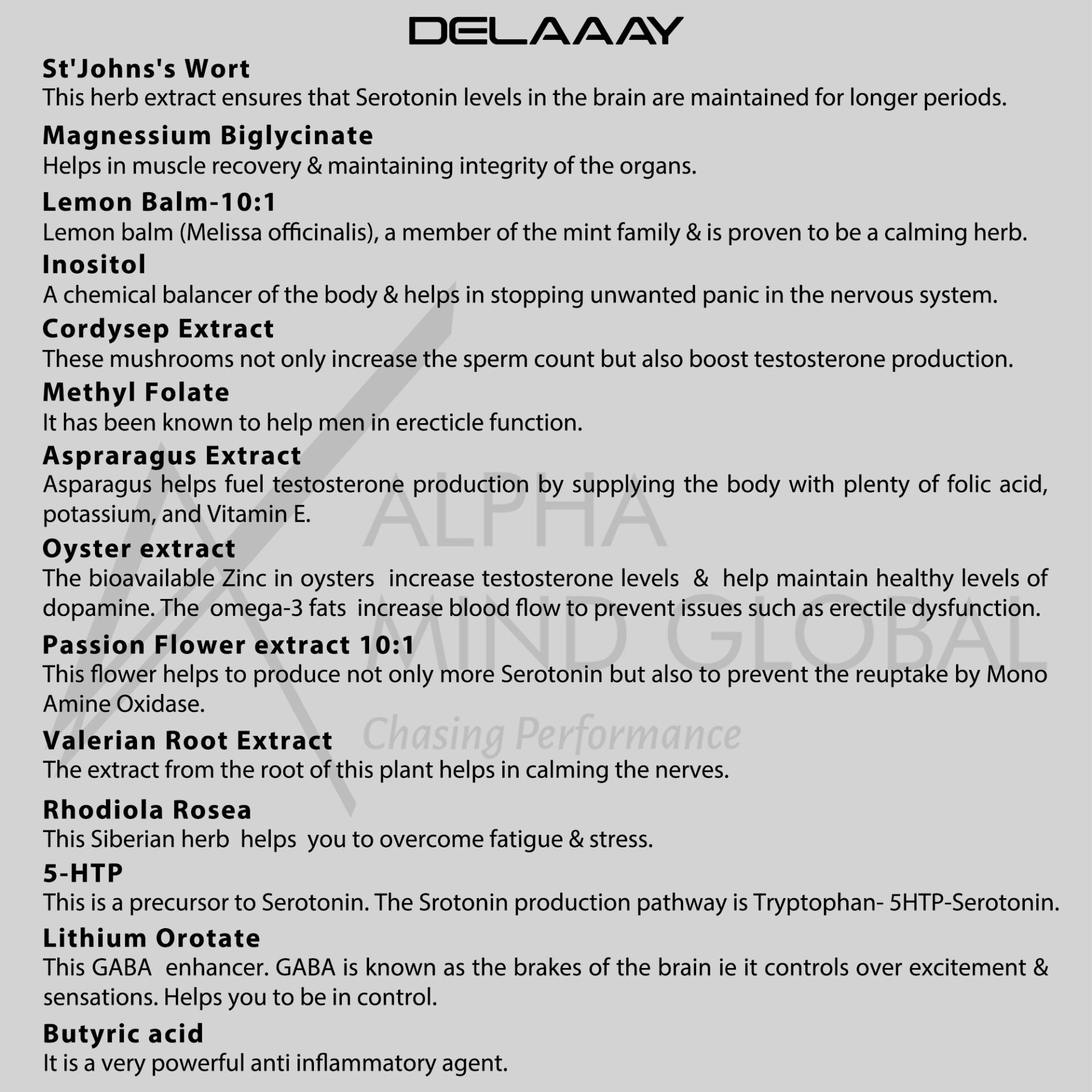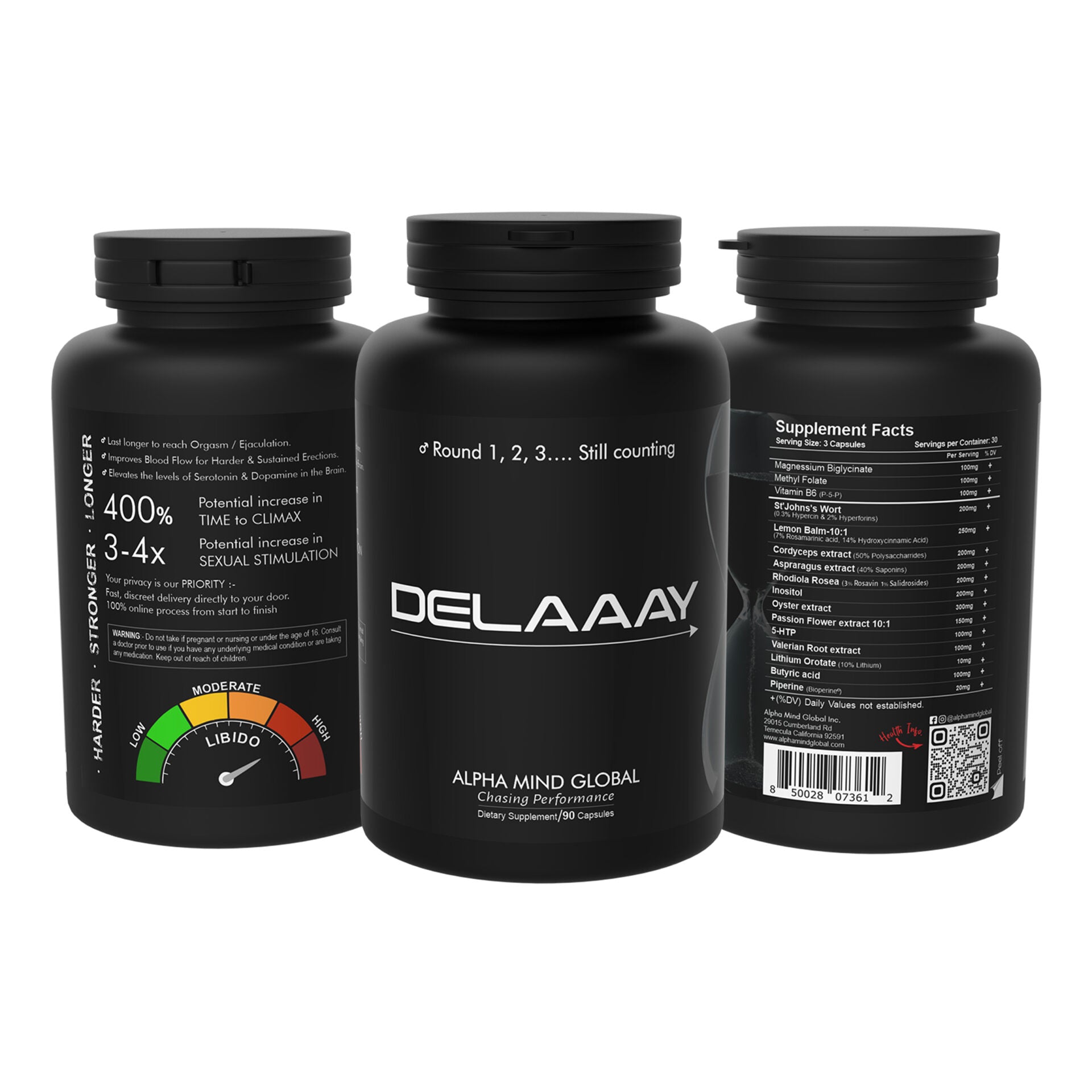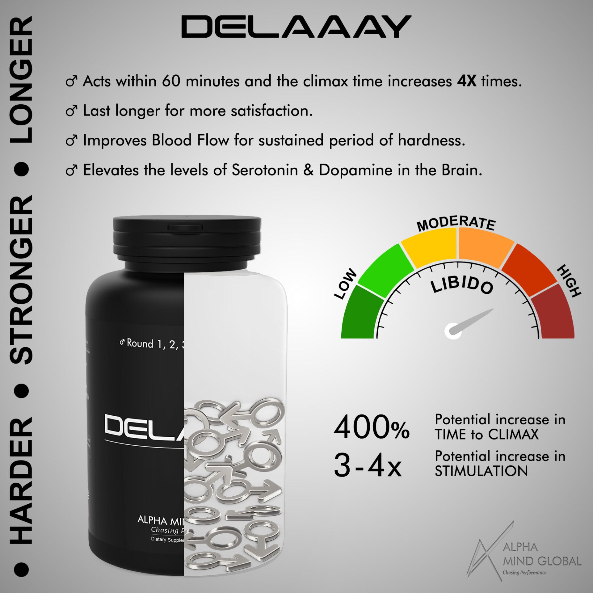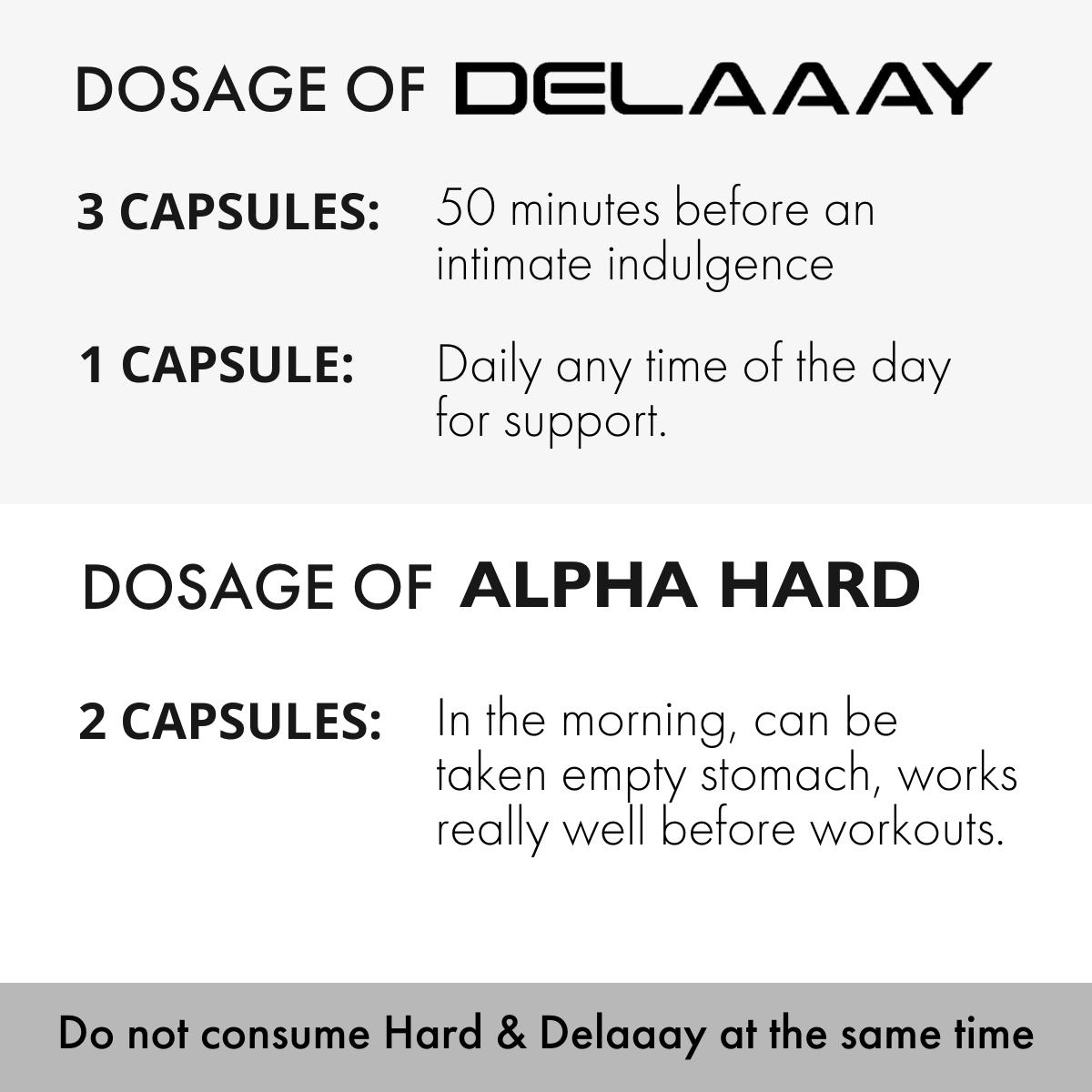 Dosage of Alpha Delaaay - 3 capsules 50 minutes before an intimate indulgence & 1 capsule daily anytime of the day for support.