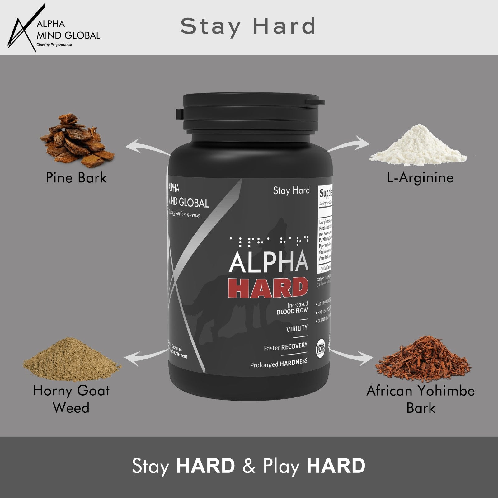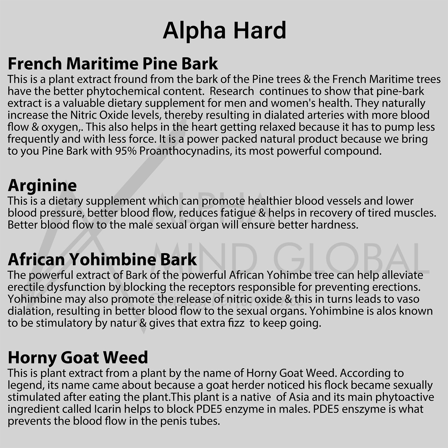 Alpha Hard has been specially formulated to start correcting male hardness problems. The specially selected & calibrated ingredients not only help to increase the blood flow to the penile and retain the blood flow in the penile area but also strengthens the penile muscles. While it is the biological mechanism part of it, Wild AfricanYohimbine bark & Horny Goat Weed Herbs increase mental stimulation. More details here...